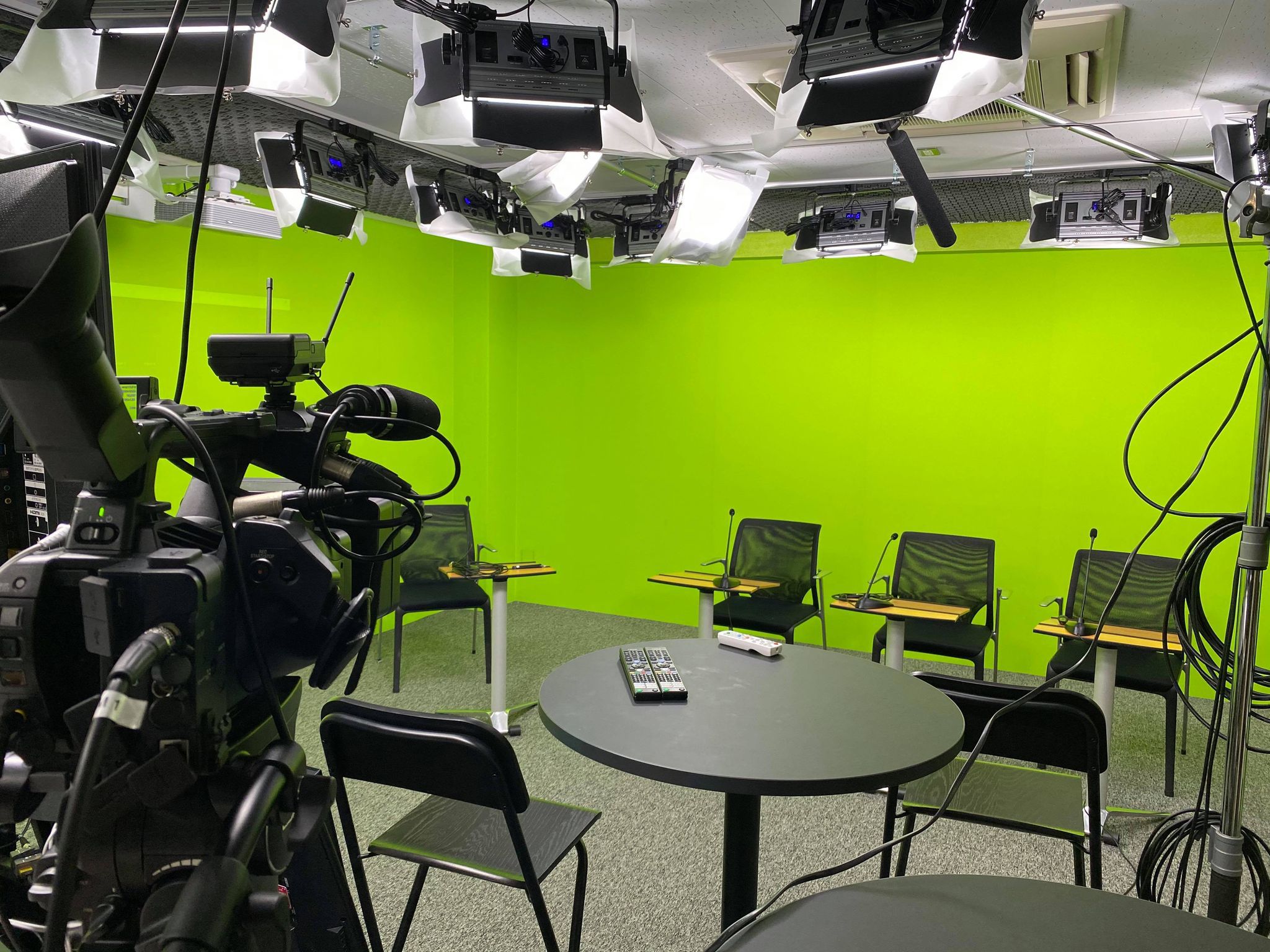スタジオは、WEB動画でよく利用される合成映像をつくるためのクロマキースタジオです。